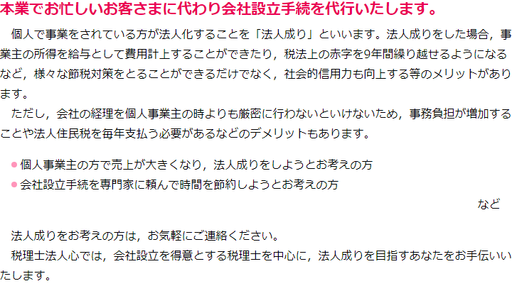大変申し訳ございませんが,担当税理士の予定が一杯のため,現在, 会社設立(法人成り)サポートについてのご相談はお受けすることができません。